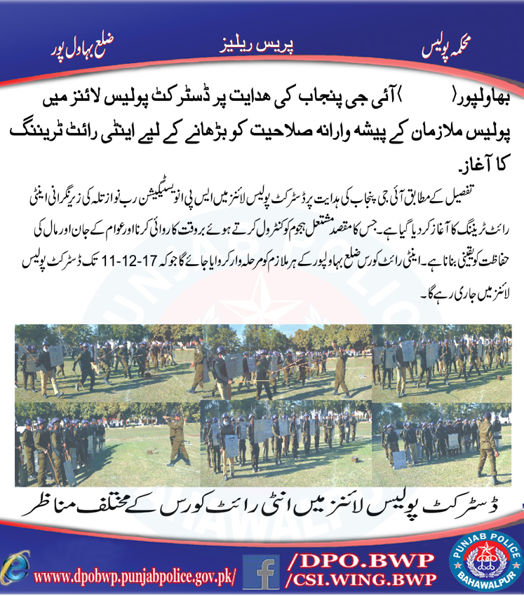 بہاولپور آئی جی پنجاب کی ہدایت پر ڈسٹرکٹ پولیس لائنز میں پولیس ملازمان کے پیشہ وارانہ صلاحیت کو بڑھانے کے لیے اینٹی رائٹ ٹرینگ کا اغاز۔