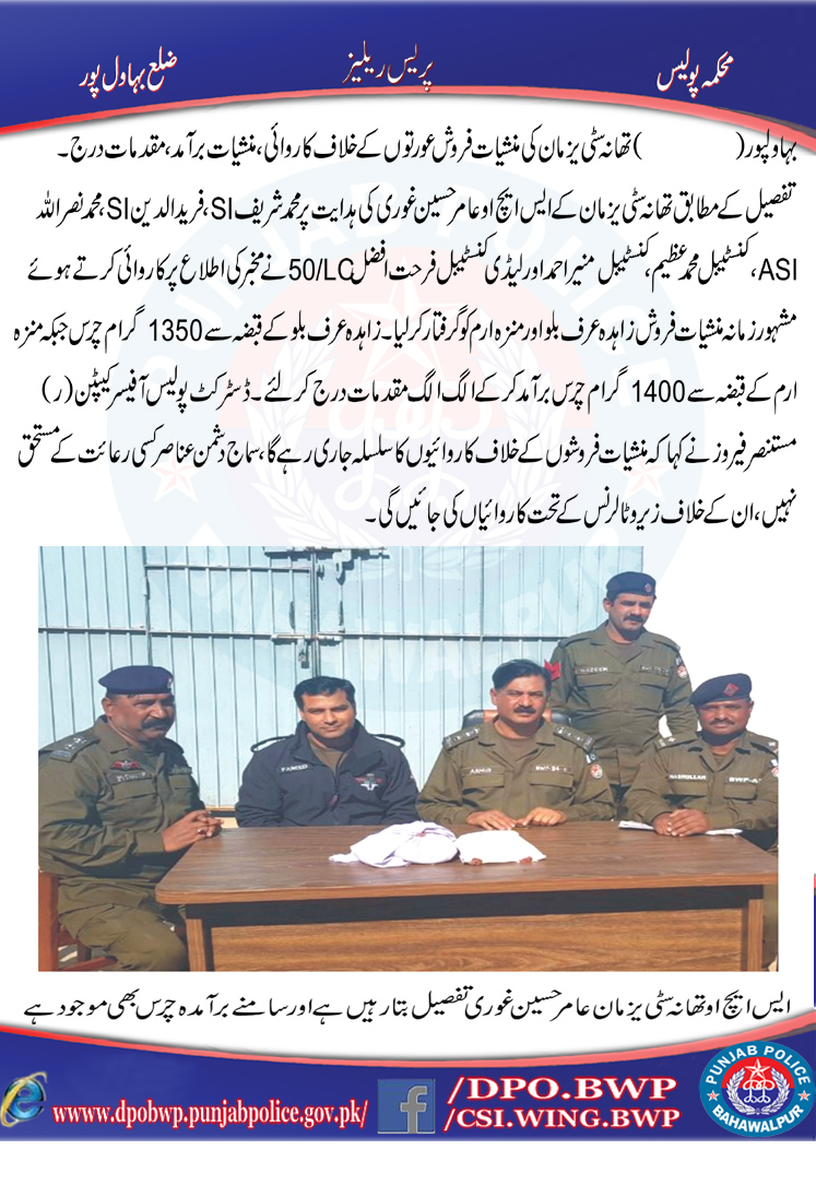 تھانہ سٹی یزمان کی منشیات فروش عورتوں کے خلاف کاروائی ،منشیات برآمد مقدمہ درج۔