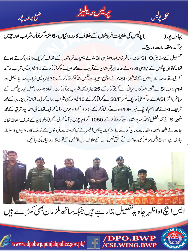 بہاولپور : مسافر خانہ پولیس کی منشیات فروشوں کے خلاف کاروائیاں ۔6 ملز گرفتار ، شراب اور چرس برآمد ، مقدمات درج۔