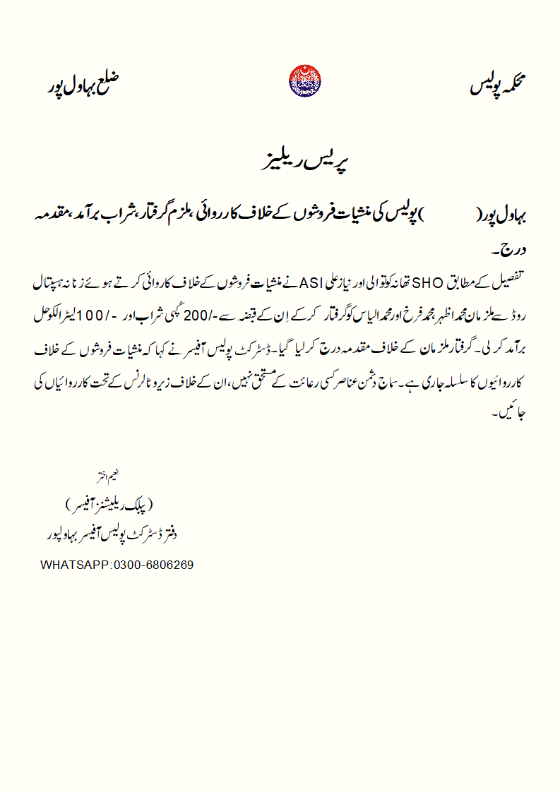 بہاولپور پولیس کی منشیات فروش کے خلاف کاروائی ، ملزم گرفتار ، چرس برآمد ، مقدمہ درج