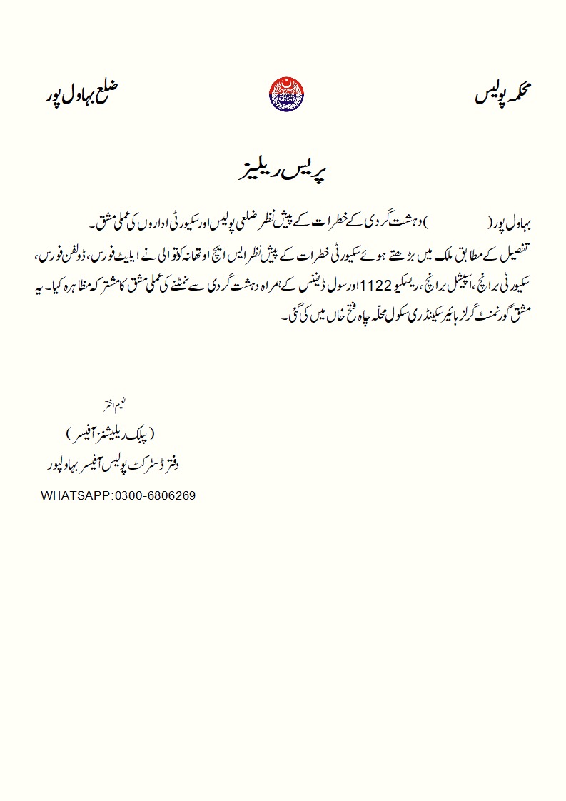 بہاول پور:SHO تھانہ کوتوالی کا ایلیٹ فورس،ڈولفن فورس، سکیورٹی برانچ، اسپیشل برانچ، ریسکیو1122اور سول ڈیفنس کے ہمراہ گورنمنٹ گرلز ہائیر سکینڈری سکول محلہ چاہ فتح خاں میں عملی مشق کا مظاہرہ:ترجمان پولیس