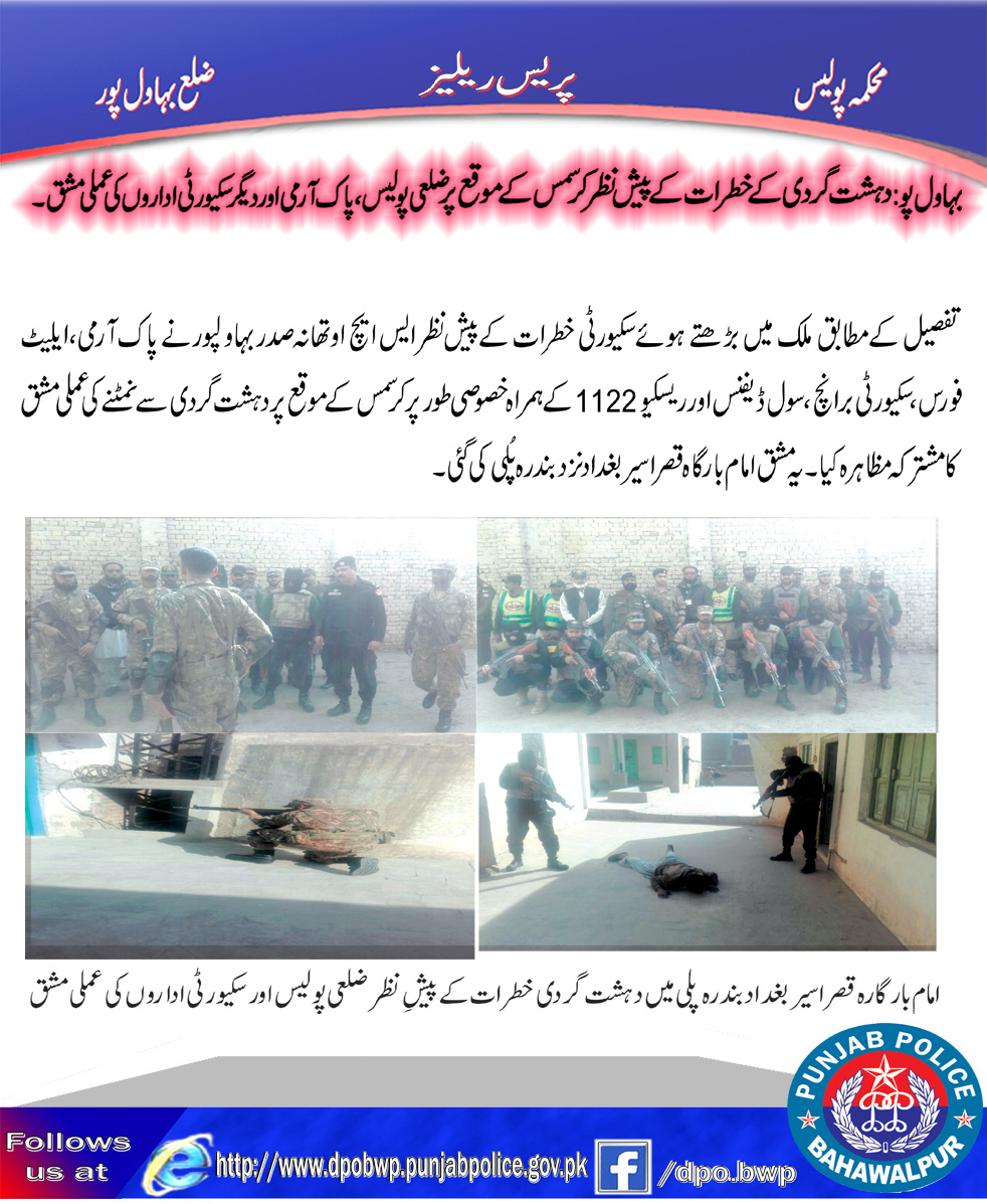 بہاولپور دہشت گردی کے خطرات کے پیش نظر کرسمس کے موقع پرضلعی پولیس ، پاک آرمی اور دیگر سکیورٹی اداروں کی عملی مشق۔