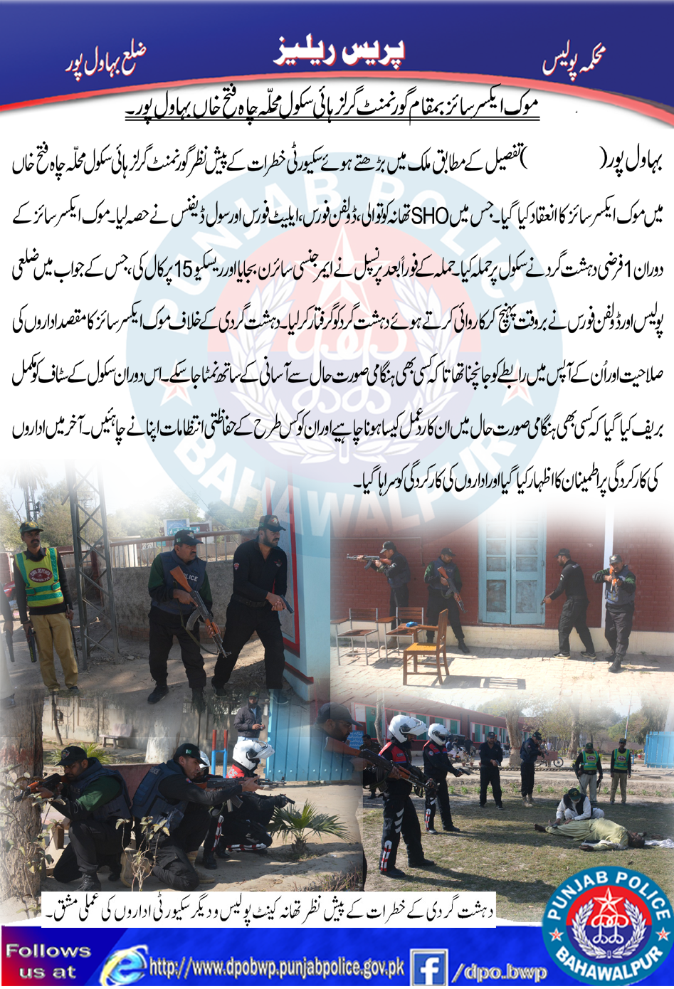 بہاول پور: آج بھی پنجاب پولیس اور دیگر سیکیورٹی اداروں کی جانب سے گورنمنٹ گرلز ہائی سکول محلہ چاہ فتح خاں میں فرضی مشق کا مظاہرہ۔ بہاولپور:فرضی مشق میں تھانہ کوتوالی پولیس،ڈولفن فورس،ایلیٹ فورس اور سول ڈیفنس نے حصہ لیا۔ بہاولپور:مختلف کالجز،سکولوں اور دیگر اداروں میں کسی بھی ناگہانی صورتحال سے بروقت نمٹنے کی پلاننگ کرنا فرضی مشق کا مقصد تھا:ترجمان بہاول پور پولیس