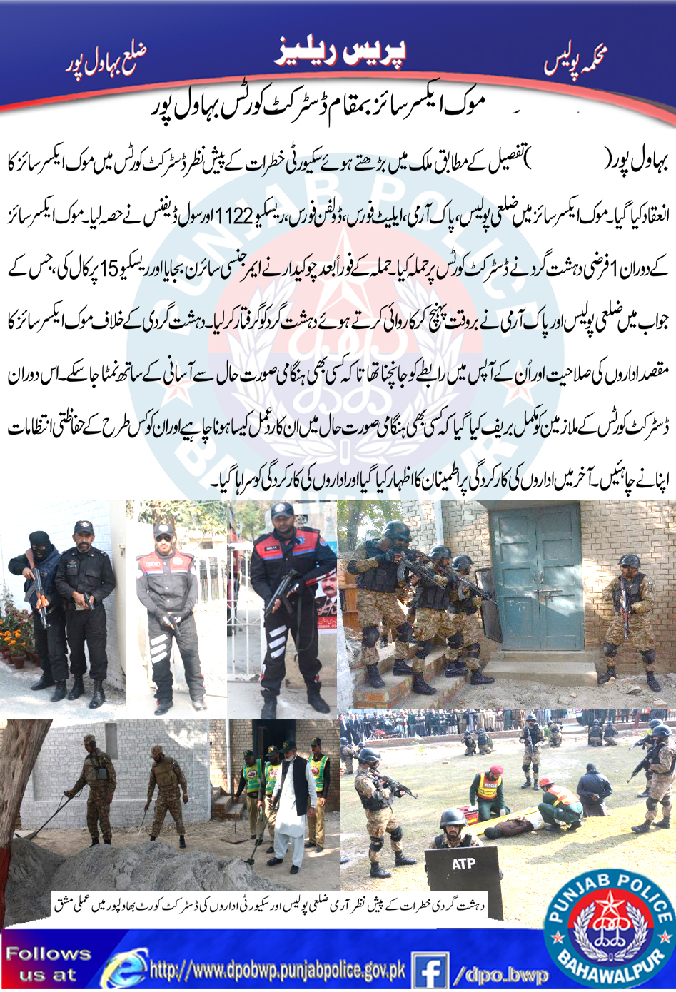 بہاول پور( )تفصیل کے مطابق ملک میں بڑھتے ہوئے سکیورٹی خطرات کے پیش نظر ڈسٹرکٹ کورٹس میں موک ایکسر سائز کا انعقاد کیا گیا۔موک ایکسر سائز میں ضلعی پولیس، پاک آرمی،ایلیٹ فورس، ڈولفن فورس،ریسکیو1122 اور سول ڈیفنس نے حصہ لیا۔موک ایکسر سائز کے دوران 1فرضی دہشت گرد نے ڈسٹر کٹ کورٹس پر حملہ کیا۔حملہ کے فوراً بعدچوکیدار نے ایمر جنسی سائرن بجایا اور ریسکیو15پر کال کی، جس کے جواب میں ضلعی پولیس اور پاک آرمی نے بروقت پہنچ کرکاروائی کرتے ہوئے دہشت گرد کوگرفتار کر لیا۔دہشت گردی کے خلاف موک ایکسر سائز کا مقصد اداروں کی صلاحیت اور اُن کے آپس میں رابطے کو جانچنا تھا تاکہ کسی بھی ہنگامی صورت حال سے آسانی کے ساتھ نمٹا جا سکے۔اس دورا ن ڈسٹرکٹ کورٹس کے ملازمین کو مکمل بریف کیا گیا کہ کسی بھی ہنگامی صورت حال میں ان کا رد عمل کیسا ہونا چاہیے اور ان کو کس طرح کے حفاظتی انتظامات اپنانے چاہئیں۔ آخر میں اداروں کی کارکردگی پر اطمینان کا اظہار کیا گیا اور اداروں کی کارکردگی کو سراہا گیا۔