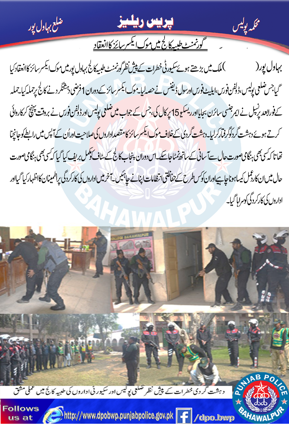 ملک میں بڑھتے ہوۓ سکیورٹی خطرات کے پیش نظر گورنمنٹ طبیہ کالج بہاولپور میں موک ایکسر سائیز کا انعقاد ۔