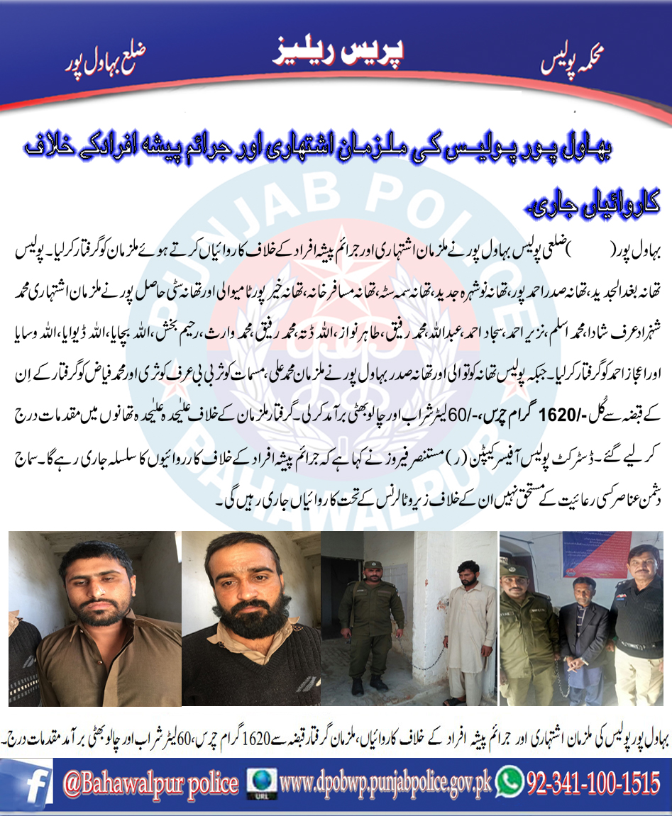 بہاولپور پولیس کی جرائم پیشہ افرادکے خلاف کارواییاں جاری ، ملزمان گرفتار،مقدمات درج۔