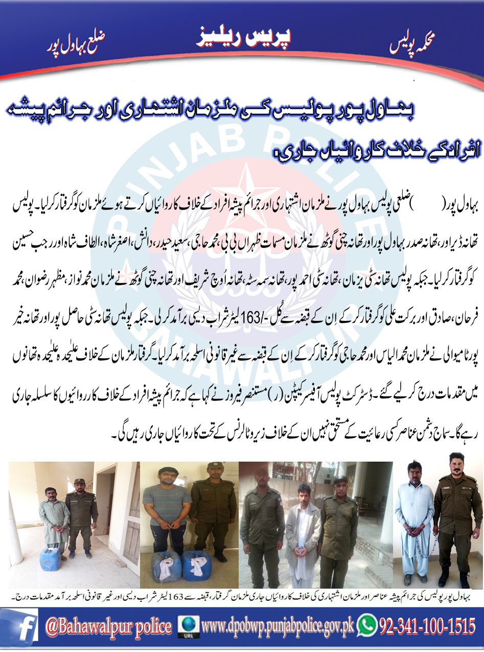 بہاولپور پولیس نے جرائم پیشہ افراد اور اشتہاریوں کے خلاف کاروائی کرتے ہوۓ ملزمان کو گرفتار کرلیا ،مقدمات درج