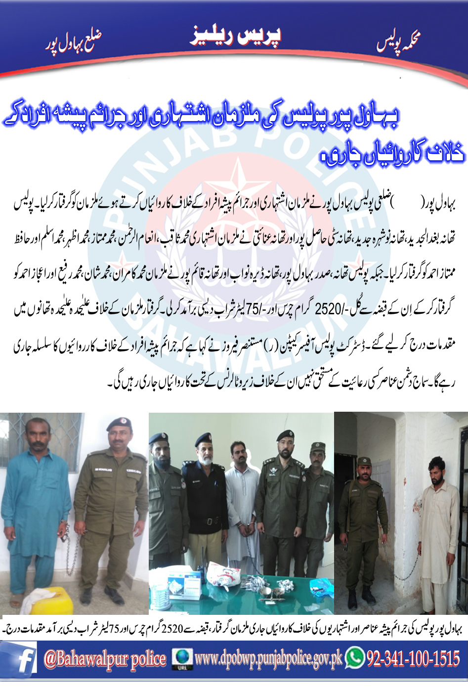 بہاولپور پولیس کی جرائم پیشہ افرادکے خلاف کارواییاں جاری ، ملزمان گرفتار،مقدمات درج۔
