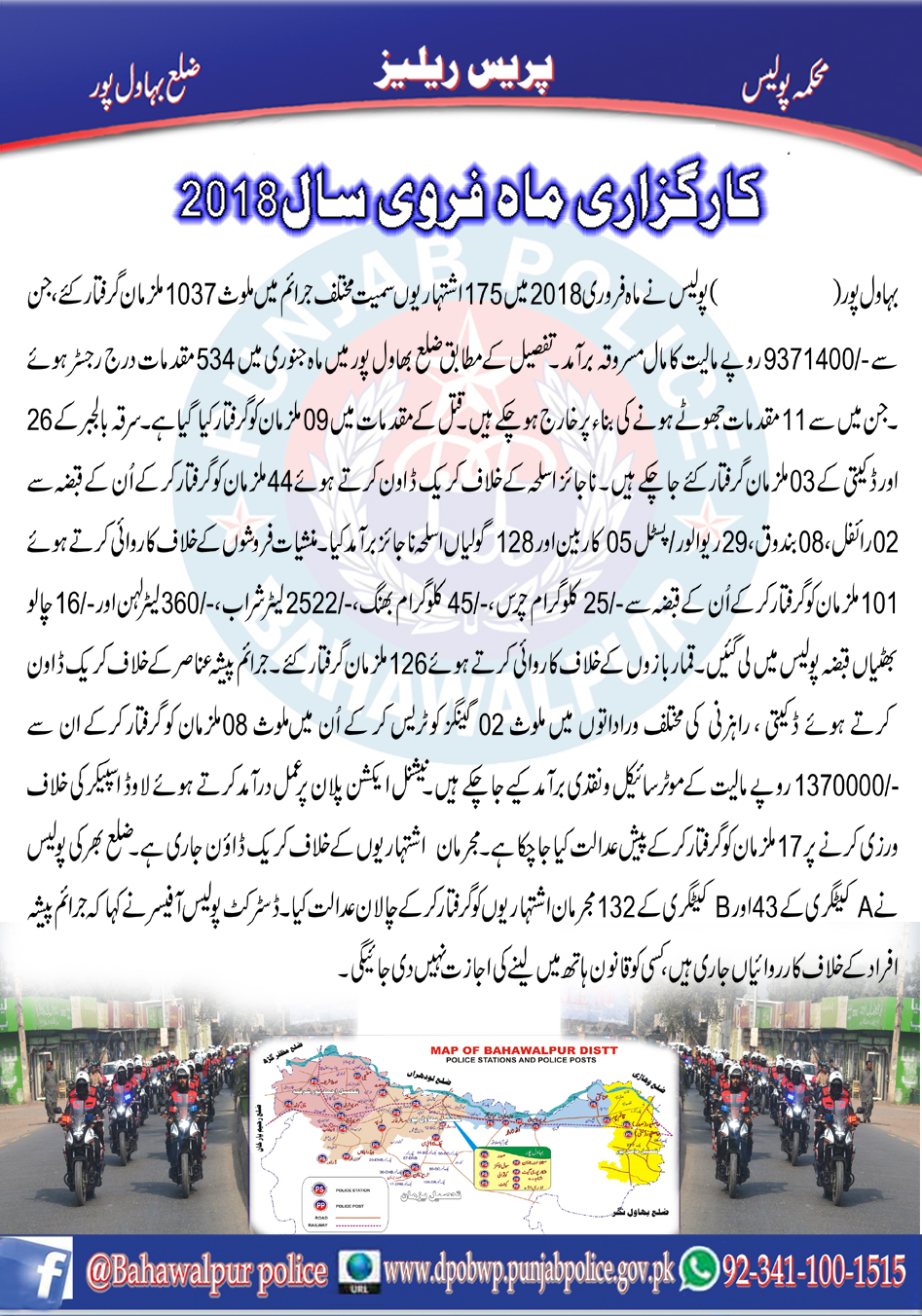 بہاولپور پولیس نے ماہِ فروری 2018 میں 175 اشتہاریوں سمیت مختلف جرائم میں ملوث 1037 ملزمان گرفتار کیے، جن سے لاکھوں روپے مالیت کامال مسروقہ برآمد کیا۔