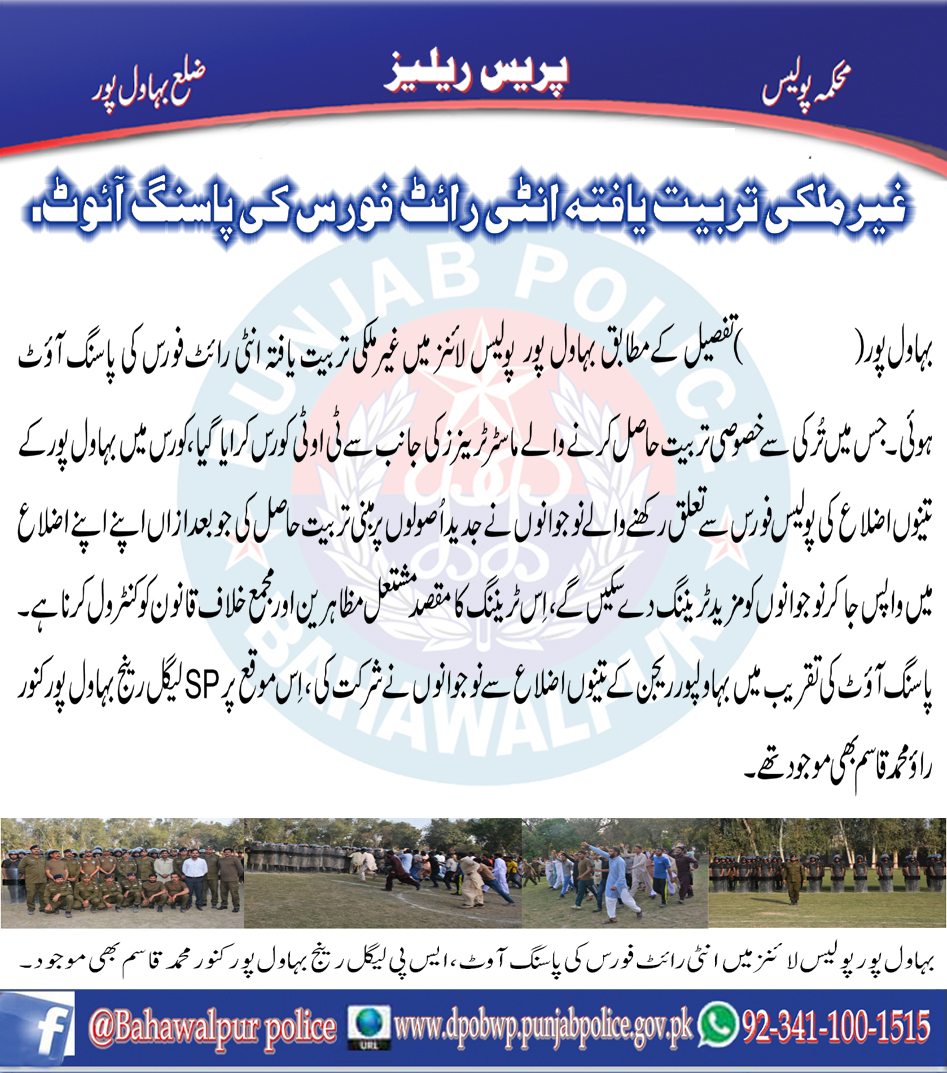 بہاولپور پولیس لائنز میں غیرملکی تربیت یافتہ انٹی رائٹ فورس کی پاسنگ آؤٹ ہوئی اس موقع پ ایس پی لیگل رینج بہاولپور کنور راؤ محمد قاسم موجود۔