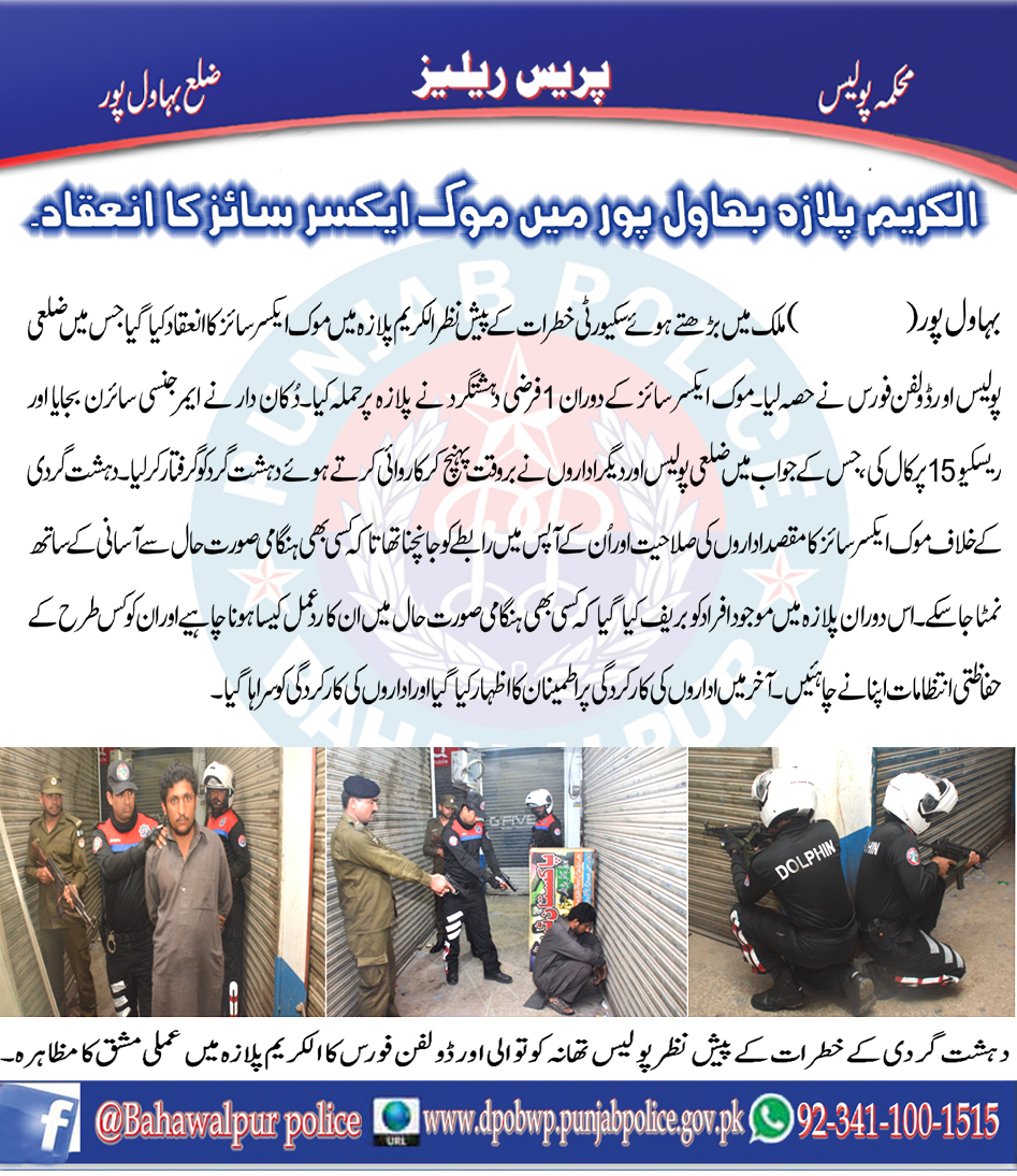 ملک میں بڑھتے ہوۓ سکیورٹی خطرات کے پیش نظر الکریم پلازہ بہاولپور میں فرضی مشق کا انعقاد ۔