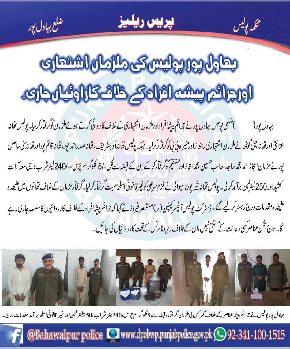 بہاولپور پولیس نے ملزمان اشتہاری اورجرائم پیشہ افرادکے خلاف کاروائی کرتے ہوۓ ملزمان کو گرفتار کرلیا ،مقدمات درج۔