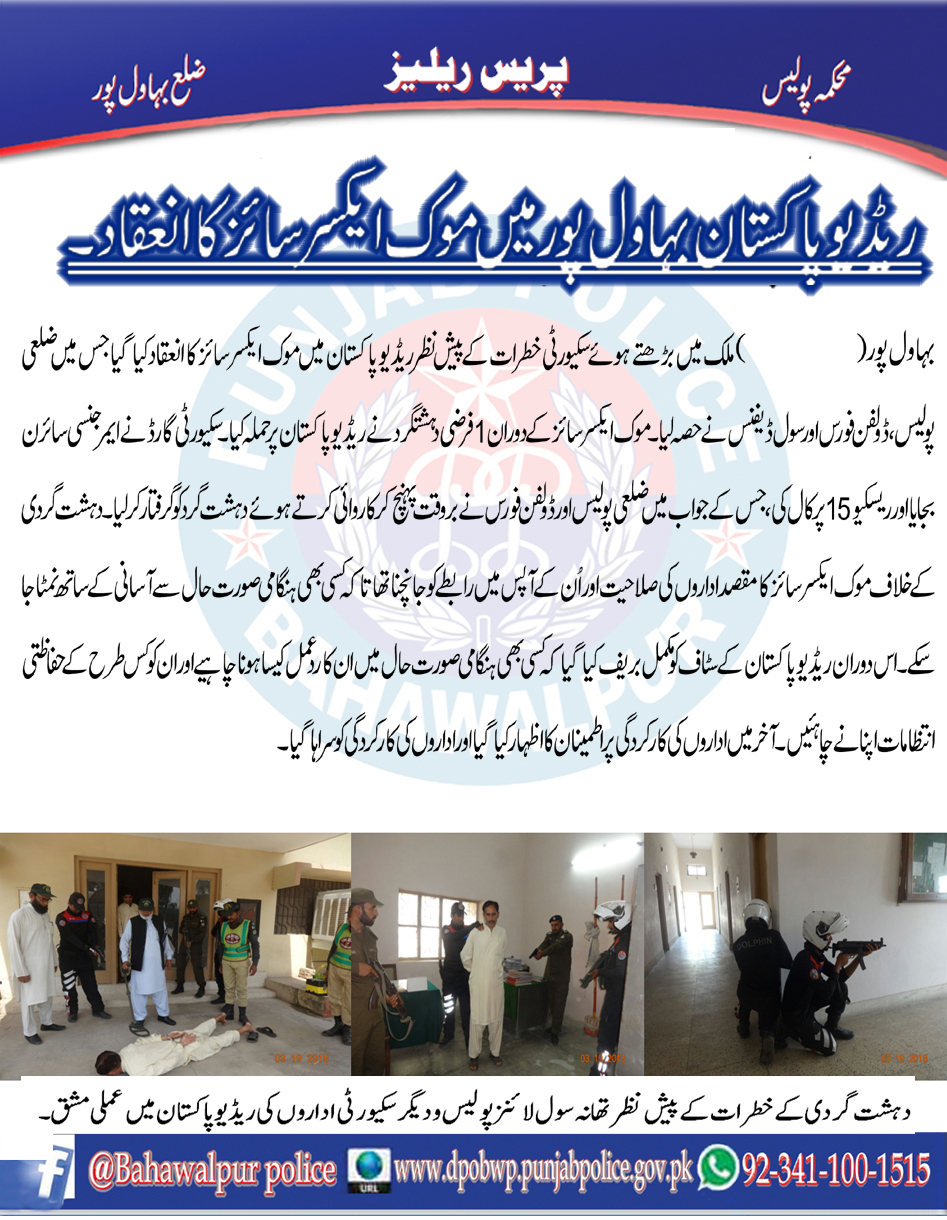 ملک میں بڑھتے ہوۓ سکیورٹی خطرات کے پیش نظر ریڈیو پاکستان بہاولپور میں موک ایکسر سائز کا انعقاد ۔