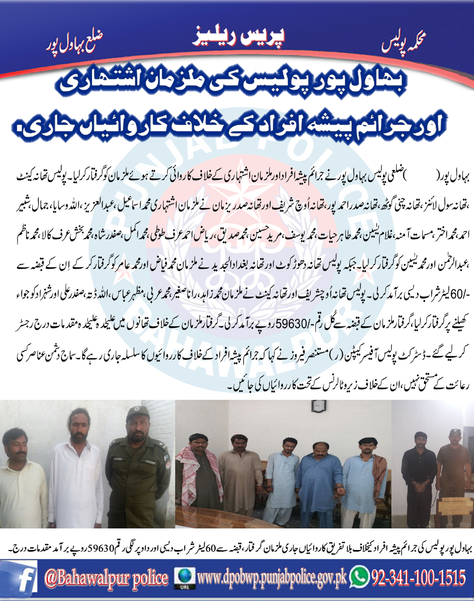 بہاولپور پولیس کی اشتہاری مجرمان اور جرائم پیشہ افراد کے خلاف کاروائی کرتے ہوۓ ملزمان کو گرفتار کرلیا ،مقدمات درج۔
