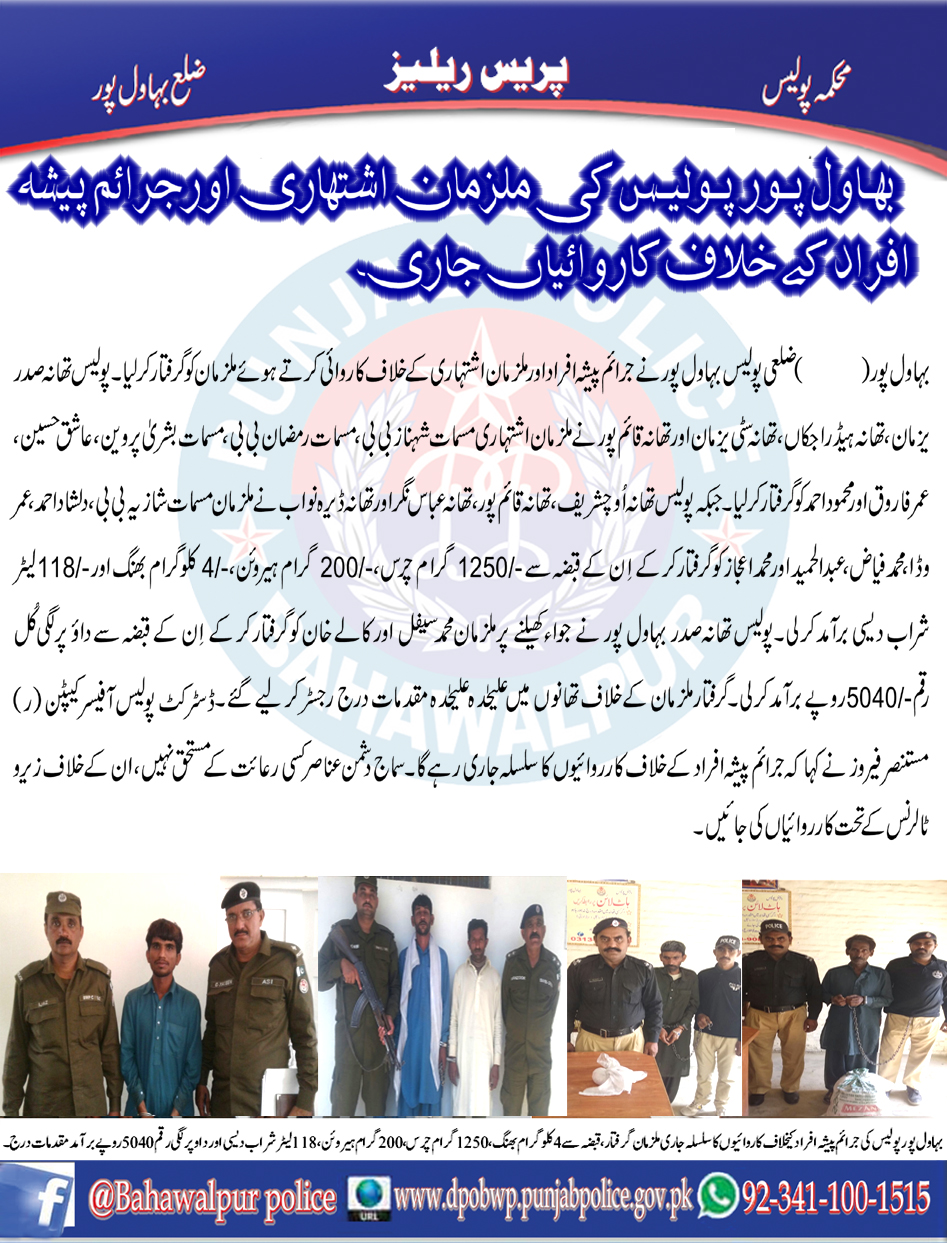 بہاولپور پولیس کی اشتہاری مجرمان اور جرائم پیشہ افراد کے خلاف کاروائی کرتے ہوۓ ملزمان کو گرفتار کرلیا ،مقدمات درج۔