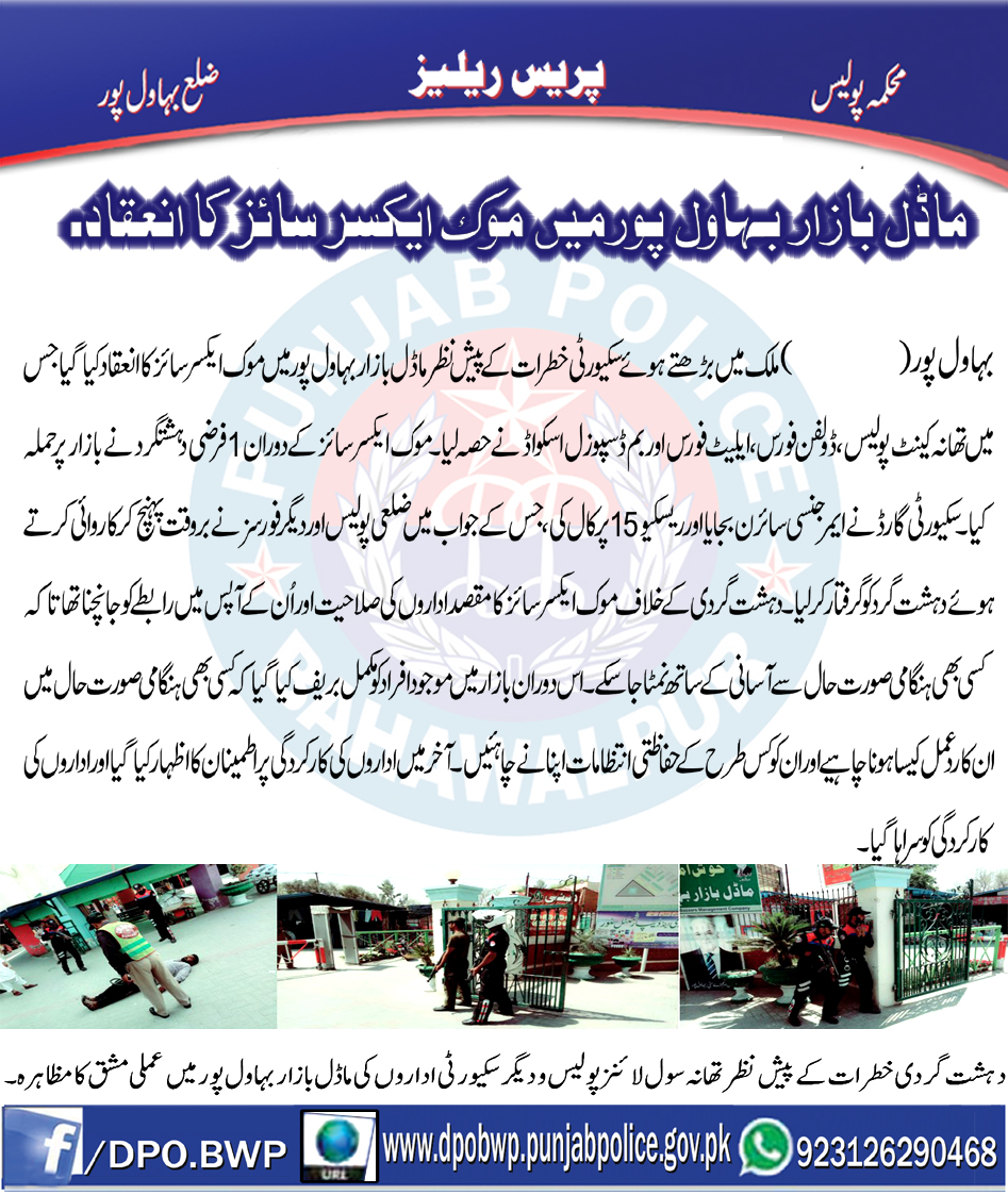 ملک میں بڑھتے ہوۓ سکیورٹی خطرات کے پیش ماڈل بازار بہاولپور میں موک ایکسر سائز کا انعقاد ۔