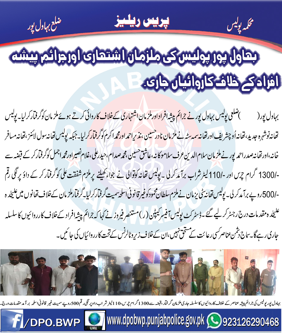 بہاولپور پولیس کی ملزمان اشتہاری اور جرائم پیشہ افرادکے خلاف کاروائیاں جاری،ملزمان گرفتار ،مقدمات کا اندراج ۔
