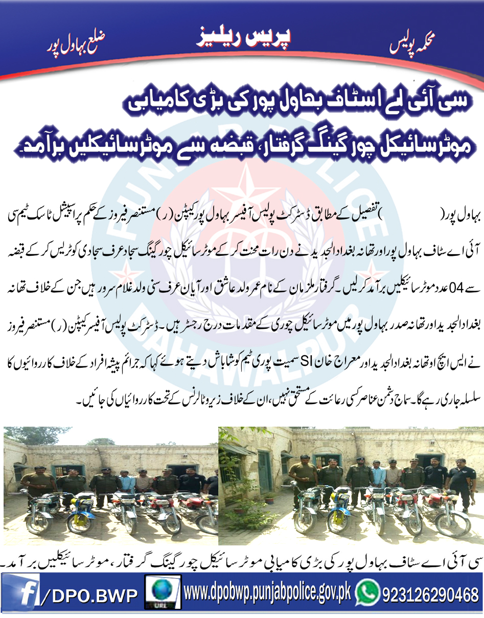 سی آئی اے اسٹاف بہاولپور کی بڑی کاروائی ، موٹر سائیکل چور گینگ گرفتار ، قبضہ سے موٹر4 سائیکلیں برآمد.