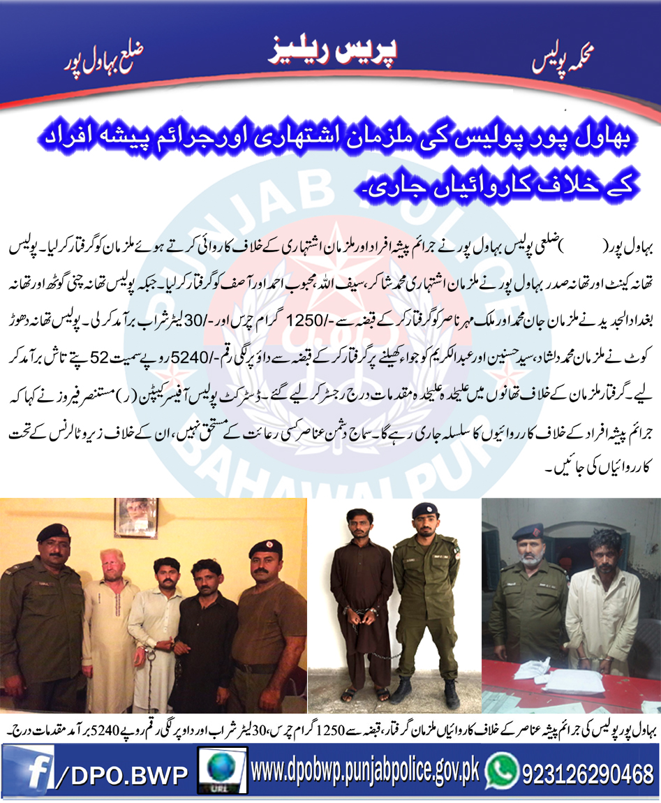 بہاولپور پولیس کی جرائم پیشہ افراد کے خلاف کاروائیاں جاری۔۔