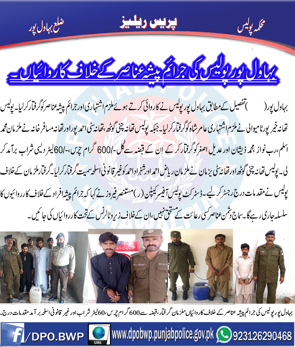 بہاولپور پولیس کا مختلف علاقوں میں جرایم پیشہ افرادکے خلاف کاروائیاں جاری