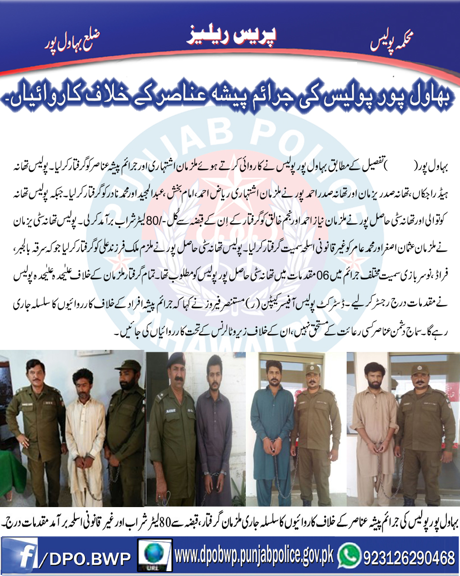 بہاولپور پولیس کی ملزمان اشتہاری اور جرائم پیشہ عناصر کے خلاف کاروائیاں جاری،ملزمان گرفتار،مقدمات درج۔